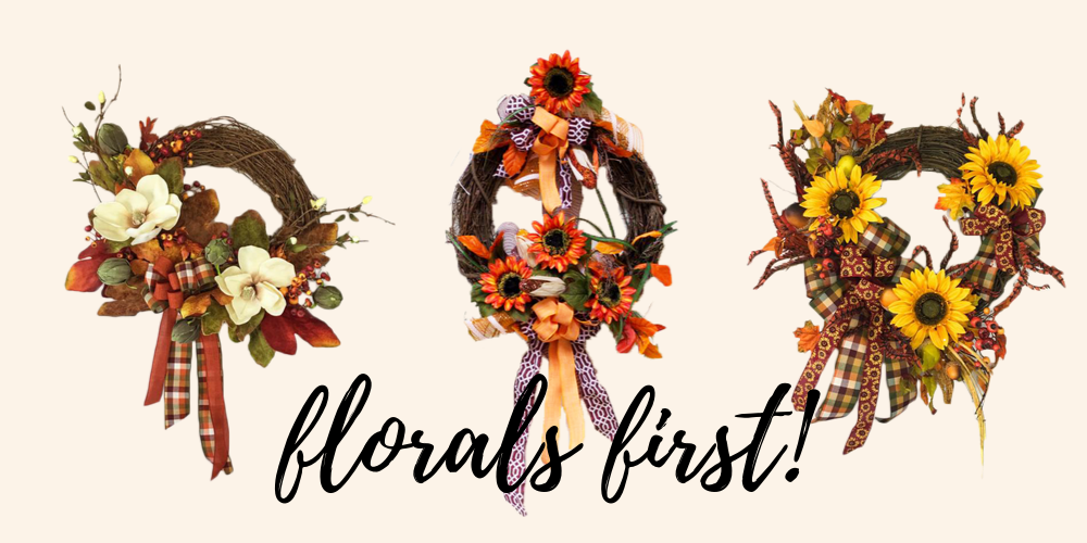 Now that you’ve got a theme narrowed down, try to find all the floral or greenery pieces you plan on using. By deciding on these first, you can hunt for the perfect ribbon that complements the novelties and natural items you’ve chosen. If you end up using a lot of acorns or pumpkins, or even a larger metal farm truck cut out, that can help decide the colors and themes of the ribbon you pick next!