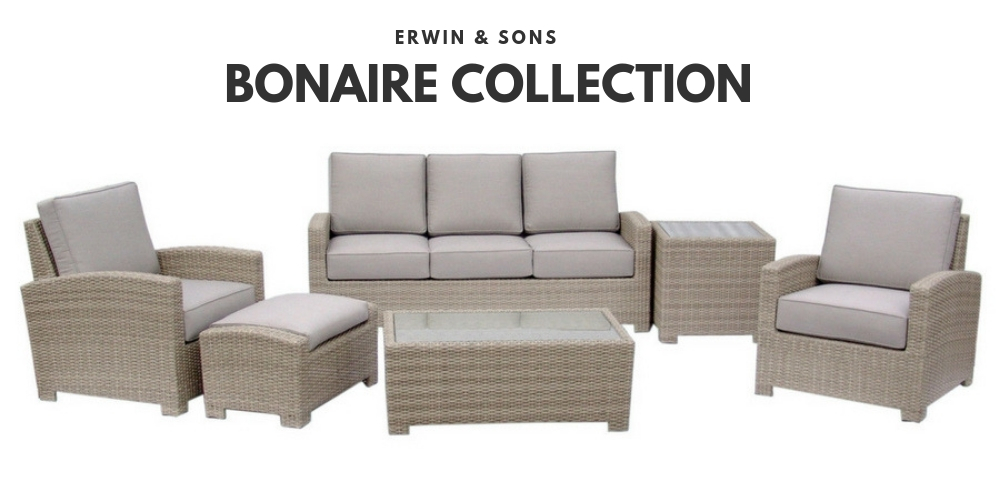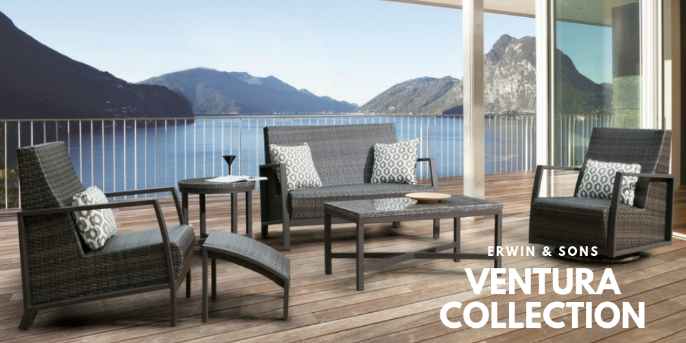 4. Ventura Collection -The Ventura Collection is unique to all of our other sets in that it offers comfort without the cushions! It has a wicker seat and back that sits in a thin aluminum frame with open arms and legs. It's a compact set that will fit comfortably on smaller patios without looking overcrowded. This set comes in the color Ash and features Erwin and Son's new padded resin seating.