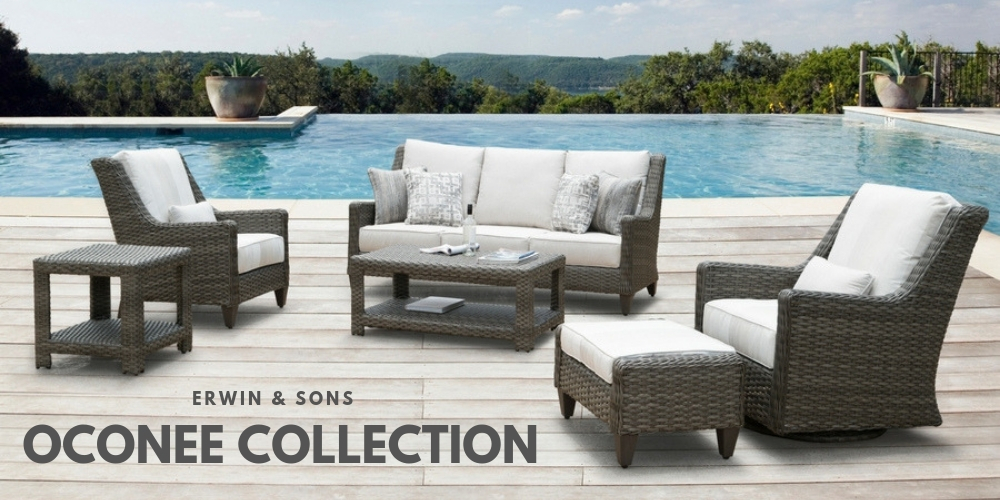 The Oconee Collection pieces include: the three-seater sofa, chair, loveseat, coffee table, end table, ottoman, and swivel glider.