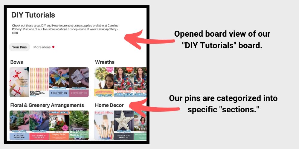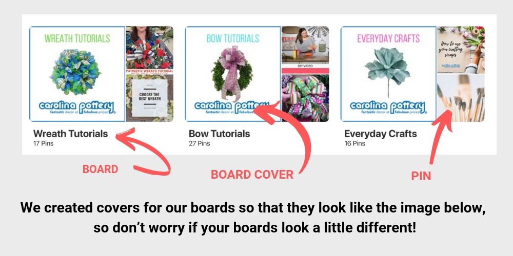 3. Create A Board: It’s time to start planning! Create a board based on the type of projects you want to work on. For example, your board might be labeled “Wreaths” or “Patio Renovation” or “Graduation Party.” Below are some examples of some boards we have to organize our pins. We have boards for wreath tutorials, Christmas tutorials, outdoor living items and decor, mesh & ribbon options…and so much more.
