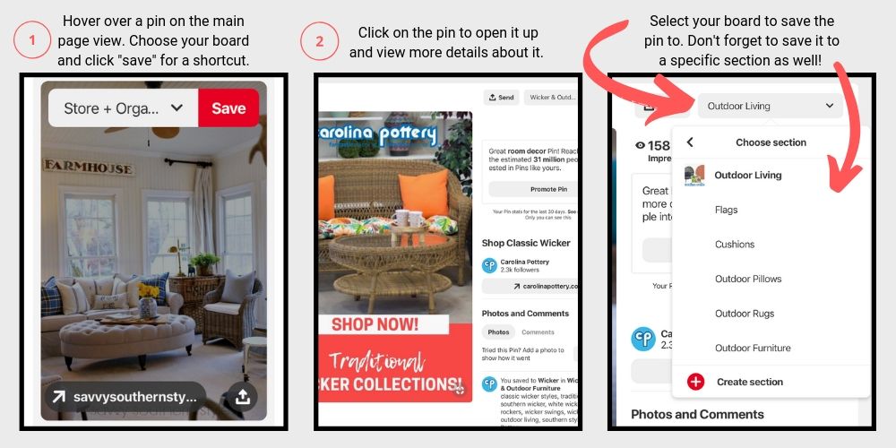 1. Hover over the pin and select the board you want to put the pin on. Then click “save” and keep scrolling! This is the short cut version