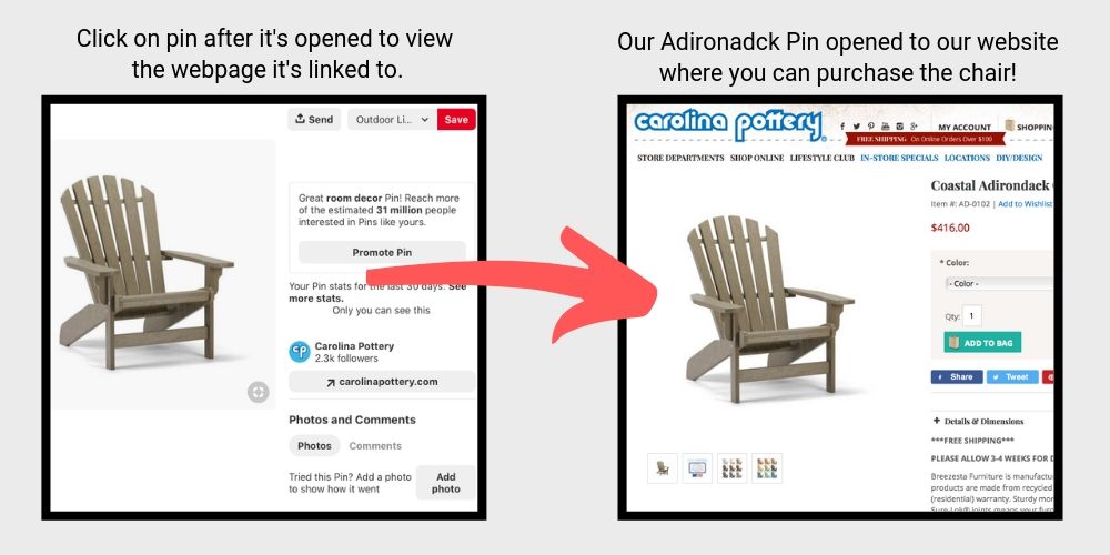 So for our patio example, if you’re looking for patio furniture and click on our Adirondack chair pin, it will take you straight to our website where you can purchase the chair! This is helpful to know so while you’re pinning items and planning out your decor for your patio you can know if the actual items you’re pinning are available to buy online. That way you’re not doing to stores to try to find similar items, but getting the EXACT items itself that you loved!