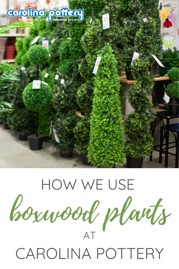 Give your any place in your home a touch of green with boxwood topiaries! We love how they look strategically placed on a table top, or even in the corner of a room with a larger plant. Of course, you can find fresh ones at your local nursery, but if you’re not someone who can boast of having a green thumb, that’s okay! We carry many realistic boxwoods at Carolina Pottery in various sizes and shapes.