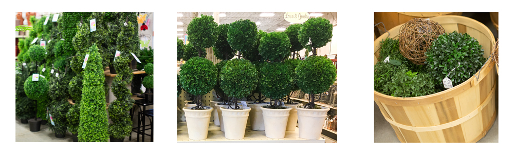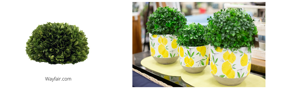 We’re excited about this new trend in interior decorating, and we are pretty sure you will want to try this yourself! Boxwood toppers are a half-sphere of faux greenery with a plastic bottom underneath. They can be placed on top of large candle-holders, or on top of a small round container to make it look like an arrangement! This means NO hot glue or inserting picks or bushes into a floral styrofoam. The boxwood toppers can be swapped out for other items depending on the season or your mood!